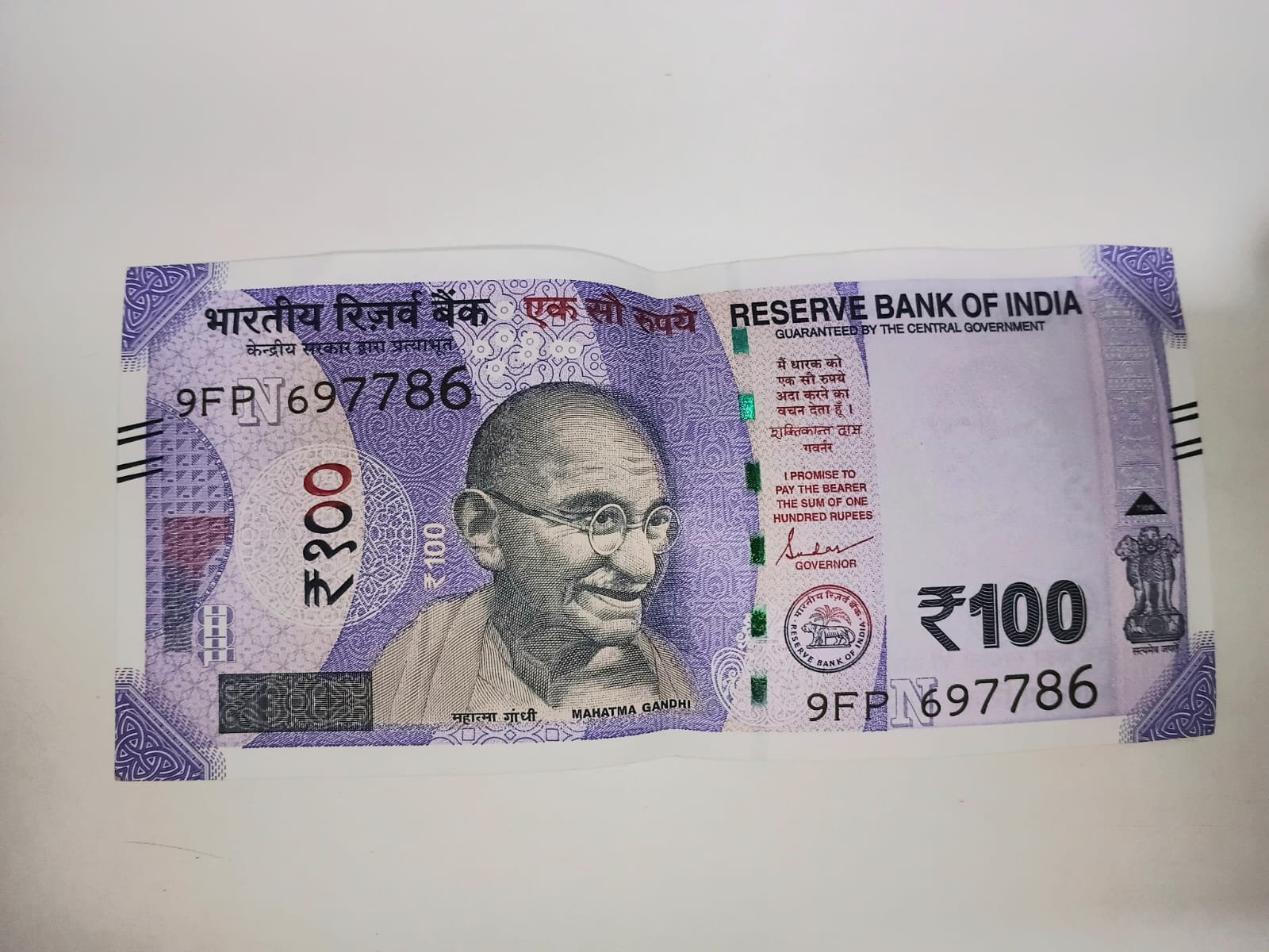 Indian ₹100 note from the Mahatma Gandhi (New) Series featuring serial number 786, considered an auspicious and collectible number. Lavender color, Gandhi portrait, and Rani ki Vav reverse design.