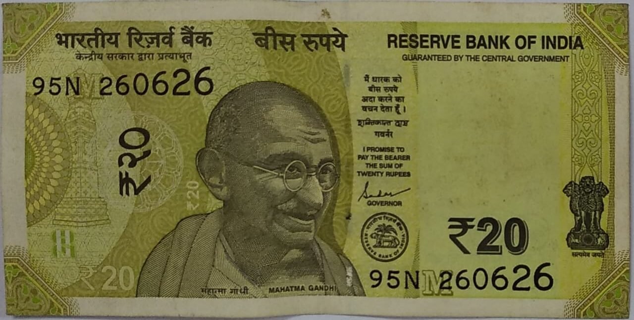 A Rs.20 Note, number is upcoming date, i.e. 26/06/26